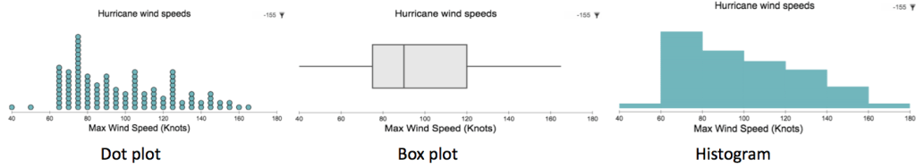 Grade 6: Display numerical data in plots on a number line, including dot plots, histograms, and box plots. Example: What are typical maximum wind speeds for Atlantic hurricanes? Sixth grade is when students start to think statistically about properties of distributions, and what range, shape, and center mean in the context of the data.