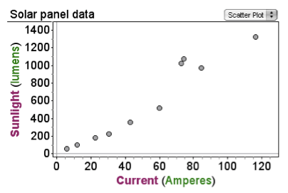 Picture solar panels on a roof connected by wire to a meter inside the building reading the number of amps produced by the panels. The scatter plot below shows the amount of current (amps) produced by a solar panel under different amounts of sunlight (lumens). The student (against convention) put the predictor variable on the Y-axis, but a relationship is still evident. That’s okay for now.